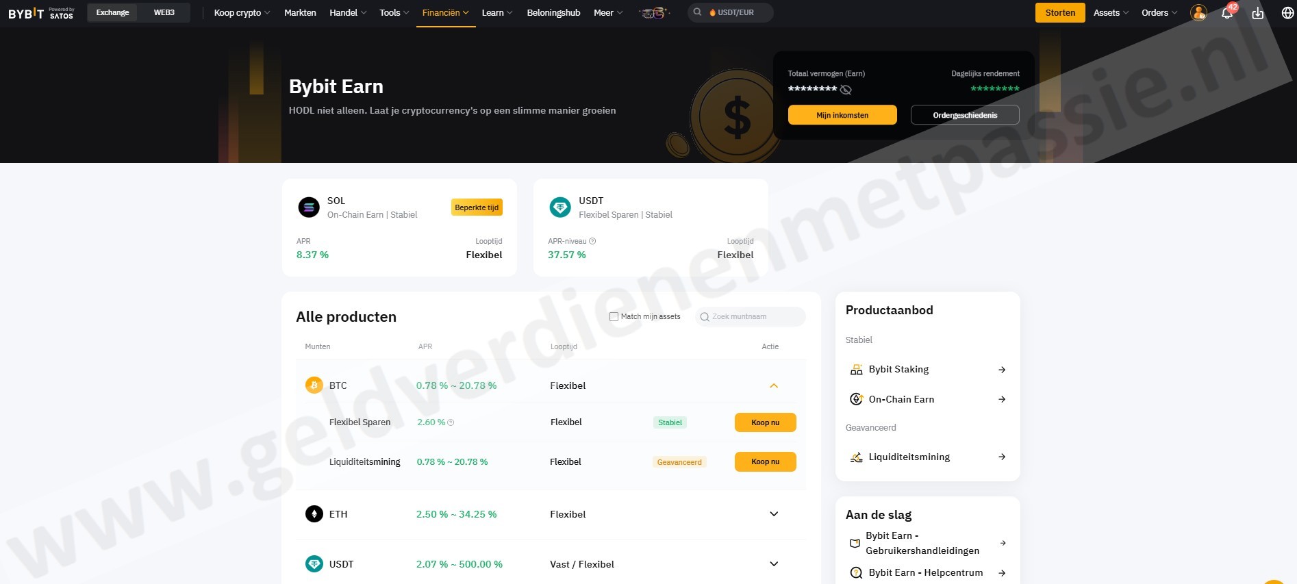 Bybit Earn laat je crypto laten groeien. Je kunt hier je munten vastzetten voor rente. Het werkt simpel. Je kiest een munt en hoe lang je deze wilt vastzetten. Daarna krijg je elke dag rente uitbetaald. De rentes zijn vaak hoger dan bij een bank.