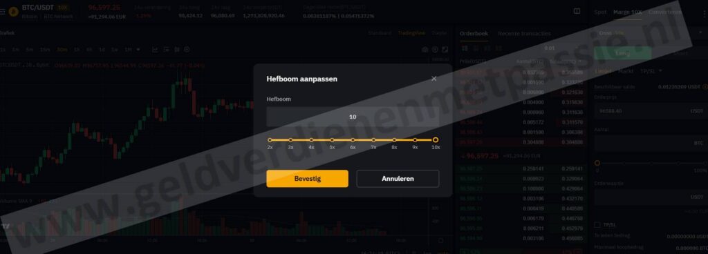 Bybit biedt hefboomhandel aan tot 10x. Dit heet margin trading. Je kunt hiermee meer winst maken, maar ook meer verliezen. Met een hefboom van 10x wordt je winst of verlies 10 keer zo groot. Pas dus op met deze riskante manier van handelen.