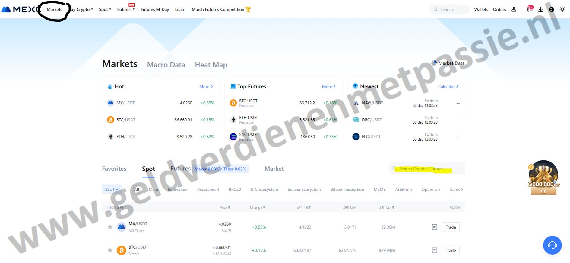 Ik klik op “Markten” in de bovenste balk aan de linkerkant van mijn scherm. Dit brengt mij naar een overzicht van alle beschikbare cryptocurrencies op de Mexc exchange. Hier zie ik verschillende soorten digitale valuta, inclusief prijzen en markttrends.