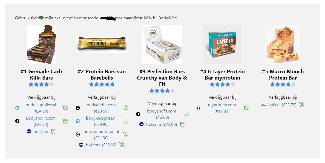 De plugin doet al het werk voor mij! Het heeft me veel tijd en moeite bespaard, wat ik nu kan besteden aan het verbeteren van mijn content en het verdienen van commissies. Hieronder een voorbeeld hoe hij draait op mijn fitness en gezondheidswebsite: