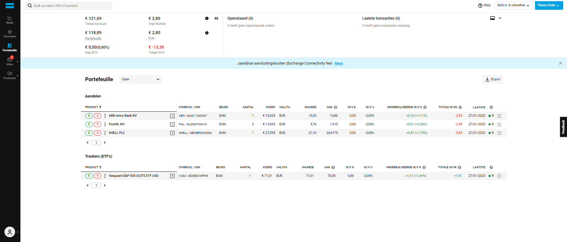 Via het dashboard zie je ook hoe de markt er momenteel voor staat. Je ziet bijvoorbeeld vermeld staan wat de best presterende aandelen zijn, maar ook wat de slechtst presterende aandelen zijn. Verder zie je ook nog staan wat de huidige koersen van de verschillende valuta’s is.