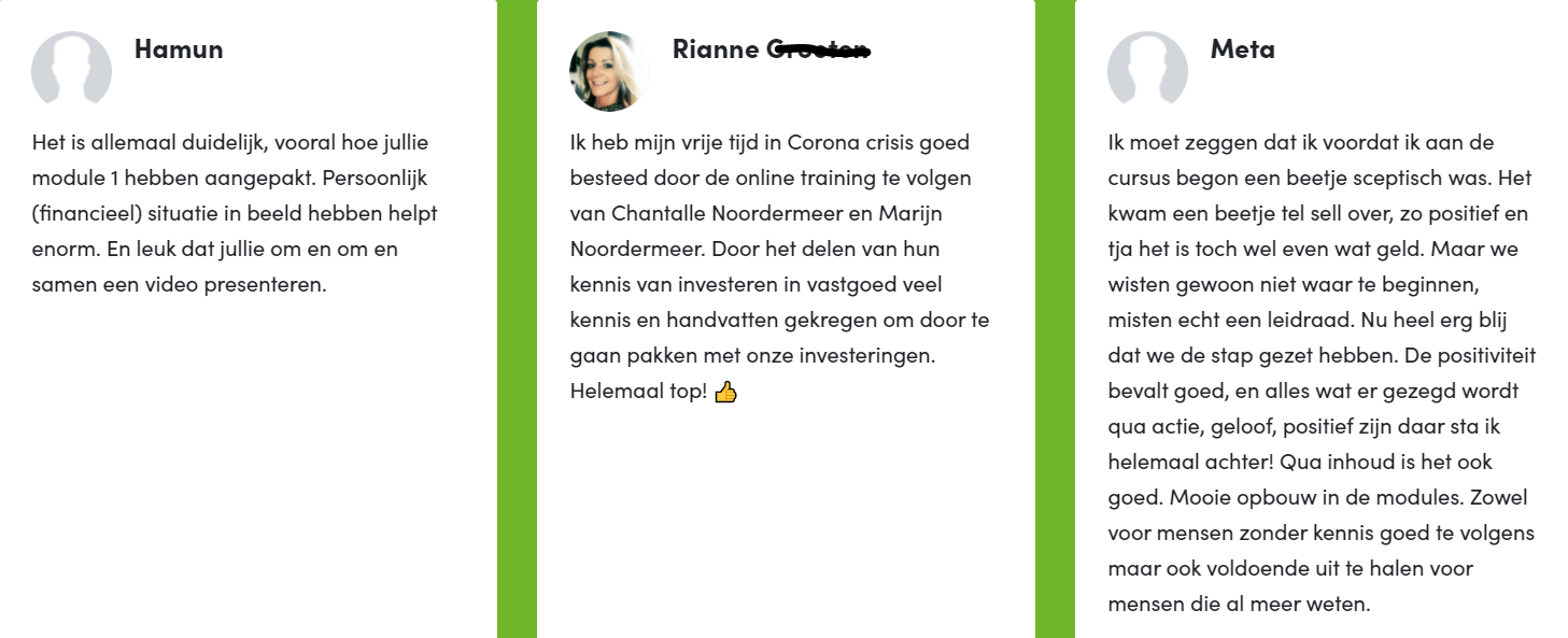 Overigens hebben Marijn en Chantalle echt veel tijd aan deze cursus besteed. Hoe ik dat zo zeker weet? Nou, dat merk je eigenlijk aan alles. Bijna nergens zijn foutjes te denken, terwijl de cursus zelf dus ook van een hoog niveau is. Bovendien merk je aan eigenlijk alles dat Marijn en Chantalle al pakweg 10 jaar bezig zijn met vastgoed. Deze interessante wereld heeft voor hen eigenlijk geen geheimen meer!