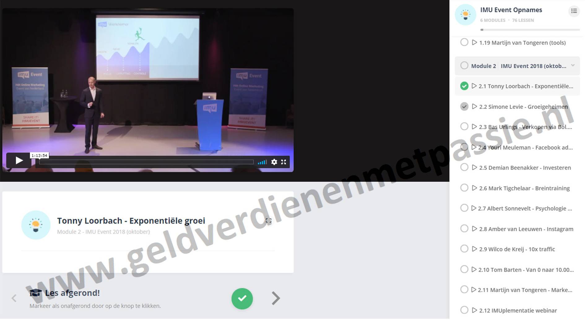 Je krijgt dan toegang tot al de IMU cursussen die normaal tussen de € 197,00 en € 297,00 per stuk kosten, daarnaast ook maandelijkse coaching en je krijgt toegang tot alle opnames van de IMU Events die afgelopen jaren zijn geweest.