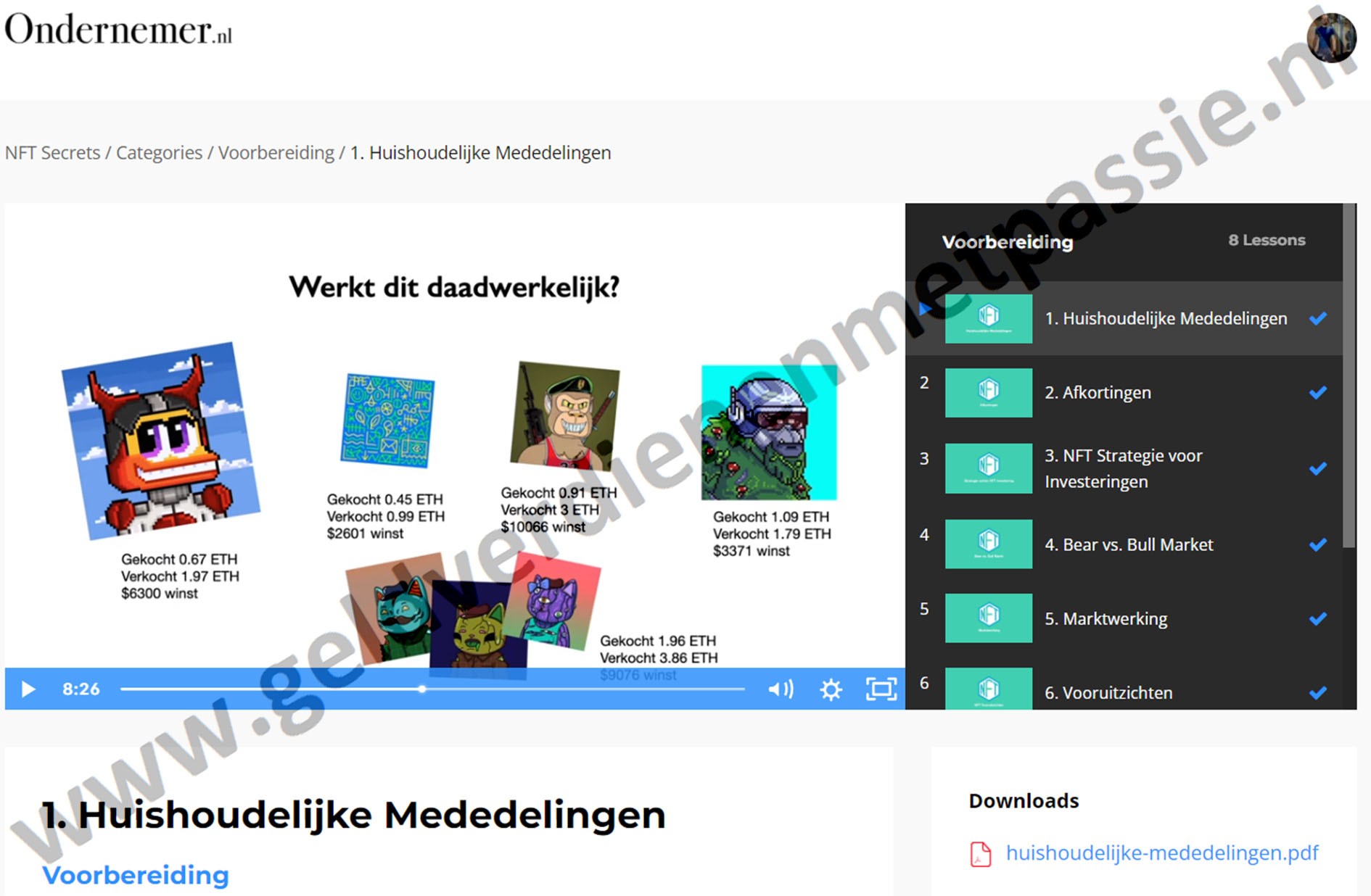 In onderstaande video geef ik je een korte rondleiding door de NFT Secrets van Mitchel van Duuren zodat je precies ziet wat je allemaal krijgt mocht je besluiten om deze cursus te kopen. Daarnaast bespreek ik ook de voor- en nadelen en de prijs.