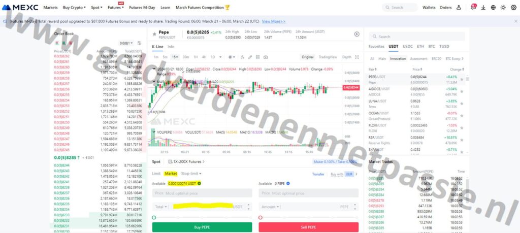 Om PONKE te kopen, ga je naar de marktplaats op MEXC. Daar vind je PONKE/USDT als handelspaar. Kies voor een marktorder als je direct wilt kopen voor de huidige prijs.