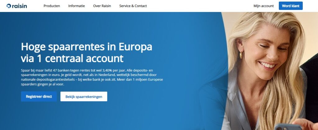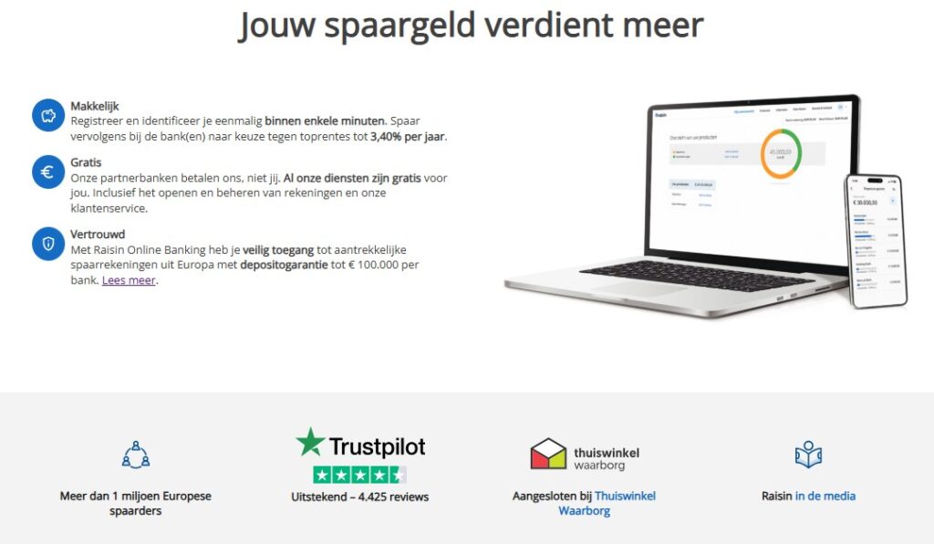 Raisin biedt spaarrekeningen met rentes tot 3,40% per jaar. Dat is veel hoger dan wat je bij Nederlandse banken krijgt. Je kunt kiezen uit meer dan 40 Europese banken en verschillende looptijden van 1 maand tot 10 jaar.