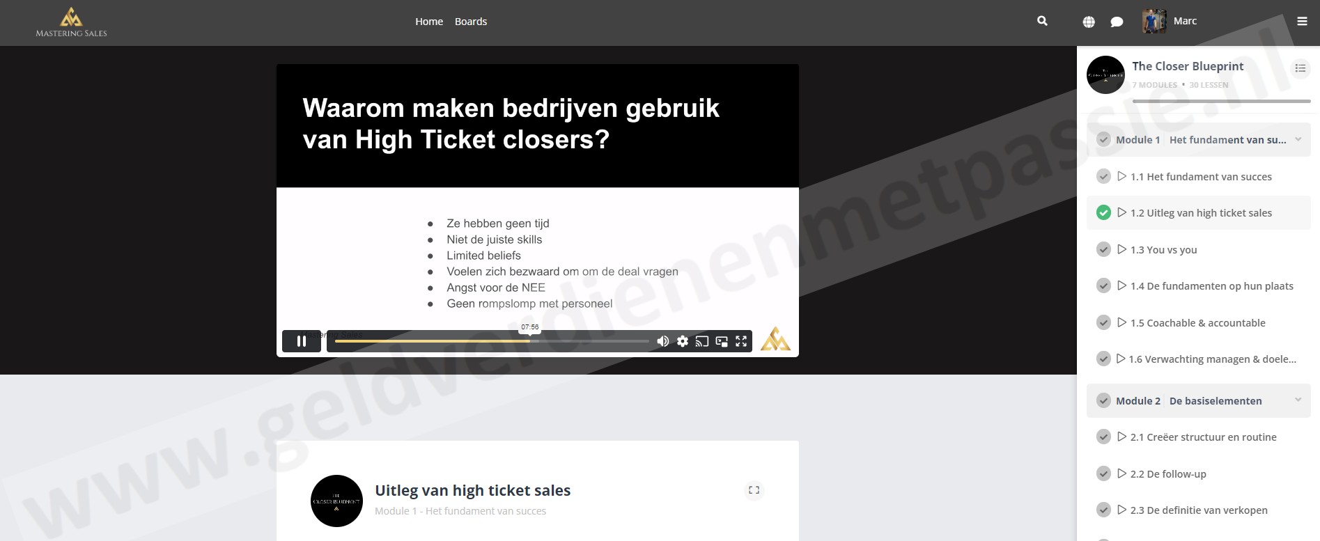 Het Sales & Systems Mastery programma biedt je toegang tot meer dan 10 uitgebreide trainingen. Je leert alles over High Ticket closing via The Closer Blueprint met zijn zeven modules en dertig lessen.