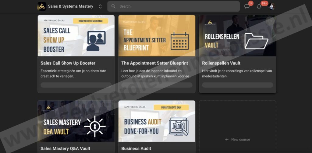 Het systeem is zo opgezet dat je stap voor stap groeit tot een betere verkoper via Skool, het leerplatform van Mastering Sales.