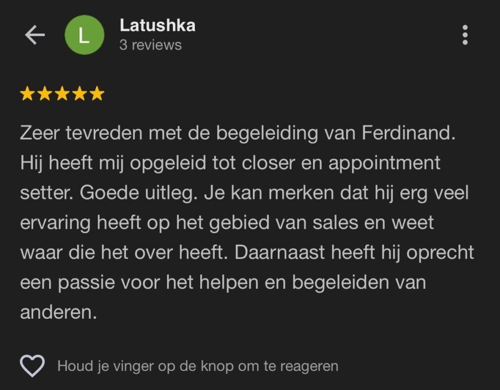Zijn systemen maken verkoop niet alleen makkelijker maar ook herhaalbaar – perfect voor ondernemers die willen groeien zonder constant nieuwe wielen uit te vinden. Daarnaast heeft hij ook maar liefst een 5.0 op google reviews en zijn mensen erg tevreden.